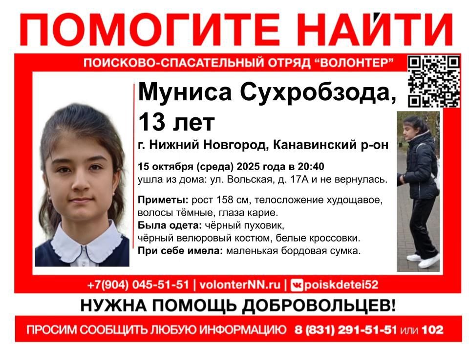 В Нижнем Новгороде в Канавинском районе пропала 13-летняя девочка. Последний раз её видели 15 октября (среда) в 20:40 на улице Вольская, ушла из дома 17А и не вернулась.